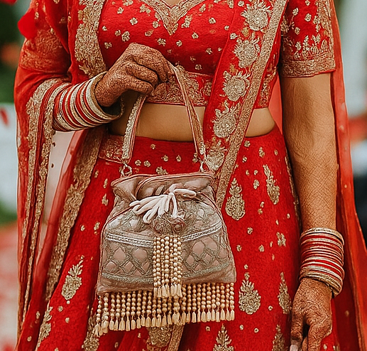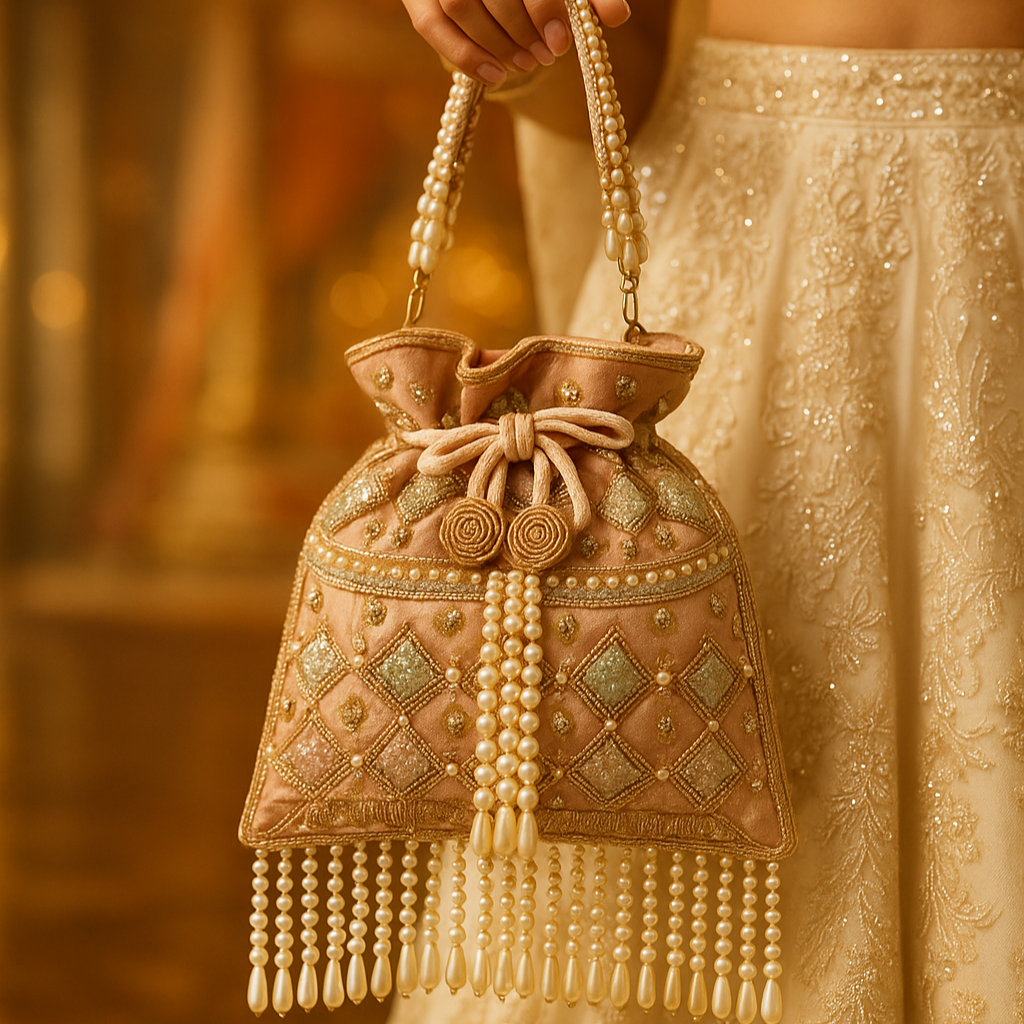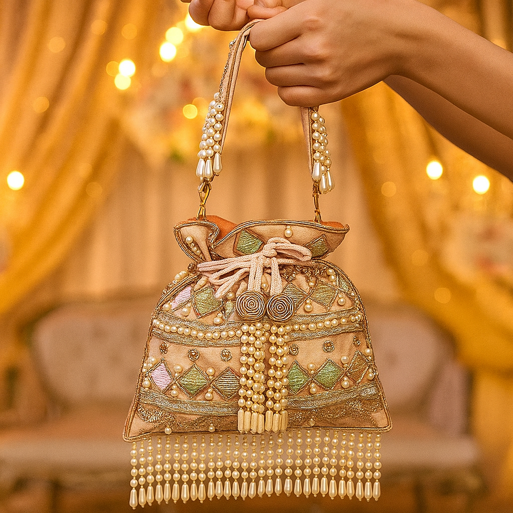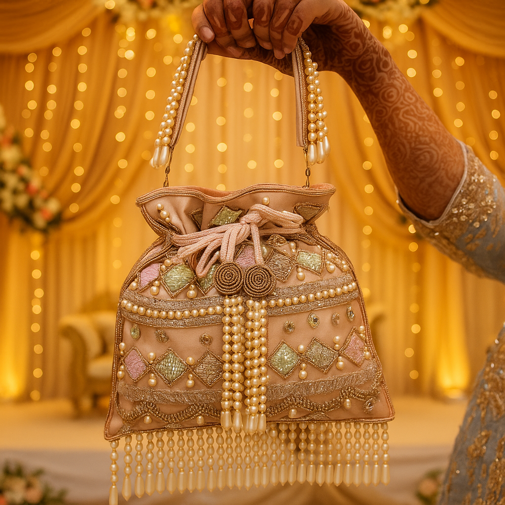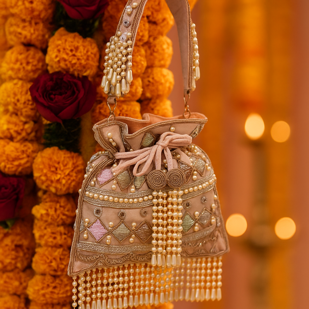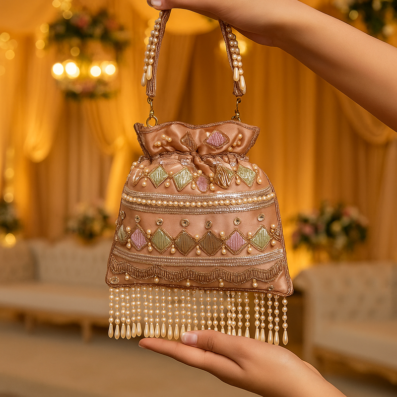 The Aarohi potli clutch in vibrant pink features intricate embroidery and delicate beadwork, blending traditional craftsmanship with contemporary style. Its compact size makes it an ideal accessory for carrying essentials, adding a touch of elegance and color to any ensemble.