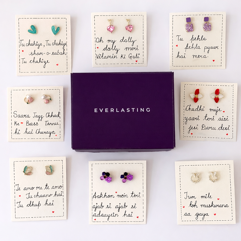 The Bollywood 8 in 1 Earring Hamper is a tribute to love, music, and timeless Bollywood romance. This thoughtfully curated hamper features 8 unique pairs of earrings, each paired with a beautifully written Bollywood-inspired love quote card that captures the magic of iconic dialogues and song lyrics.