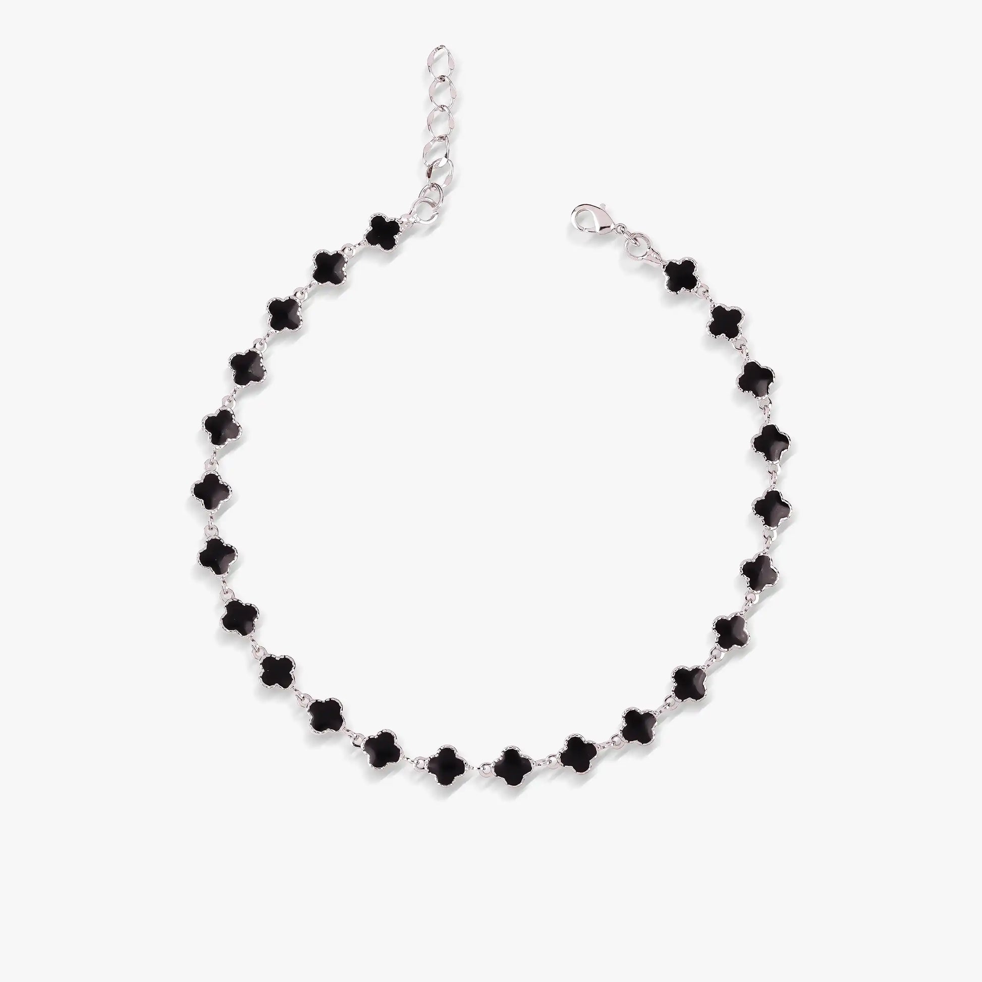 Step into timeless charm with the Clover Anklet, a striking piece that blends symbolic elegance with modern design. Featuring beautifully crafted four-leaf clovers filled with black meena enamel, this anklet brings a bold yet refined touch to your look — perfect for everyday wear or special occasions.