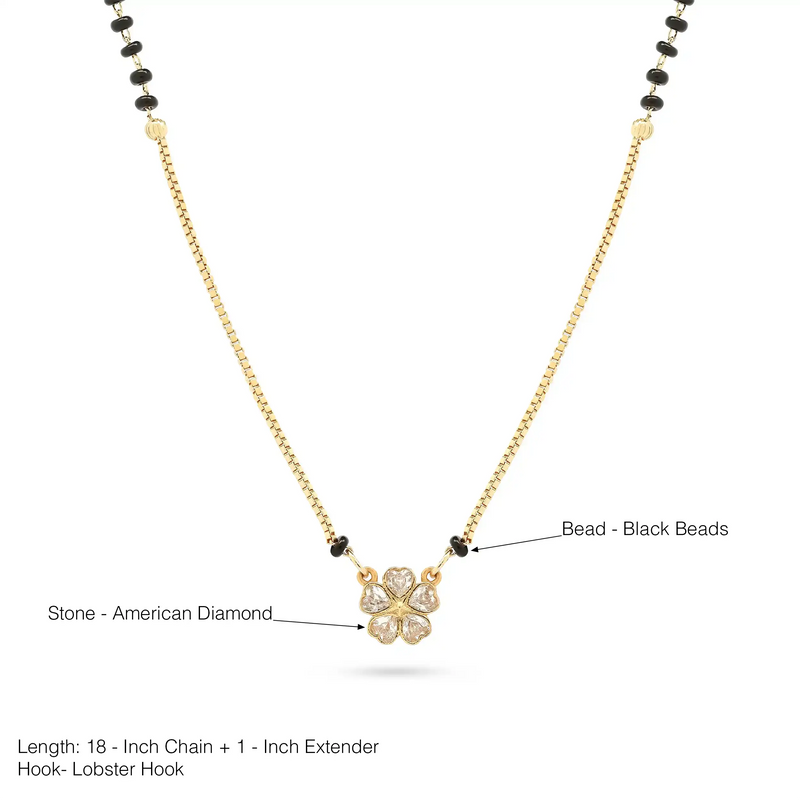 Elevate your traditional look with the Clover Mangalsutra, a perfect blend of elegance and cultural significance. Crafted to symbolize love and commitment, this mangalsutra adds a graceful charm to your wardrobe while offering timeless beauty. Its unique design beautifully complements any outfit, making it an ideal choice for daily wear or special occasions. Embrace tradition with a modern touch and make every moment unforgettable with this exquisite piece.