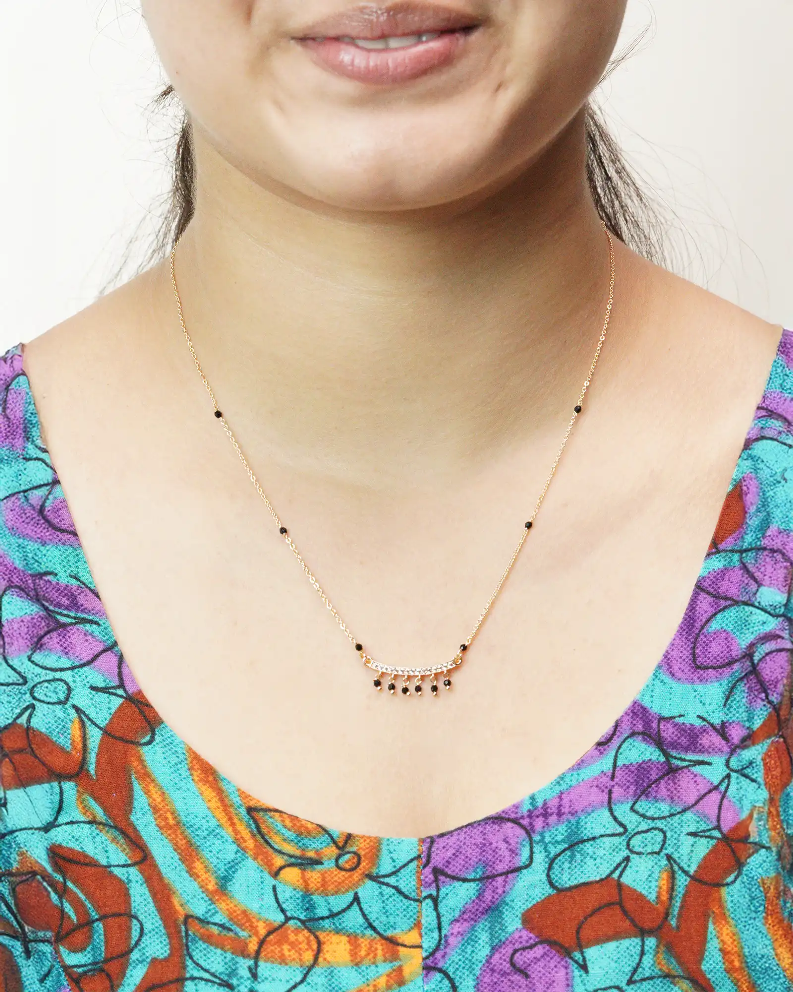 The Nandita Mangalsutra is a graceful testament to love and commitment, blending traditional charm with contemporary elegance. Crafted with a beautifully detailed pendant and a resilient chain, it offers both lasting beauty and comfort. Ideal for daily wear or special occasions, the Nandita Mangalsutra perfectly honors your unique bond while enhancing your natural elegance with timeless style.