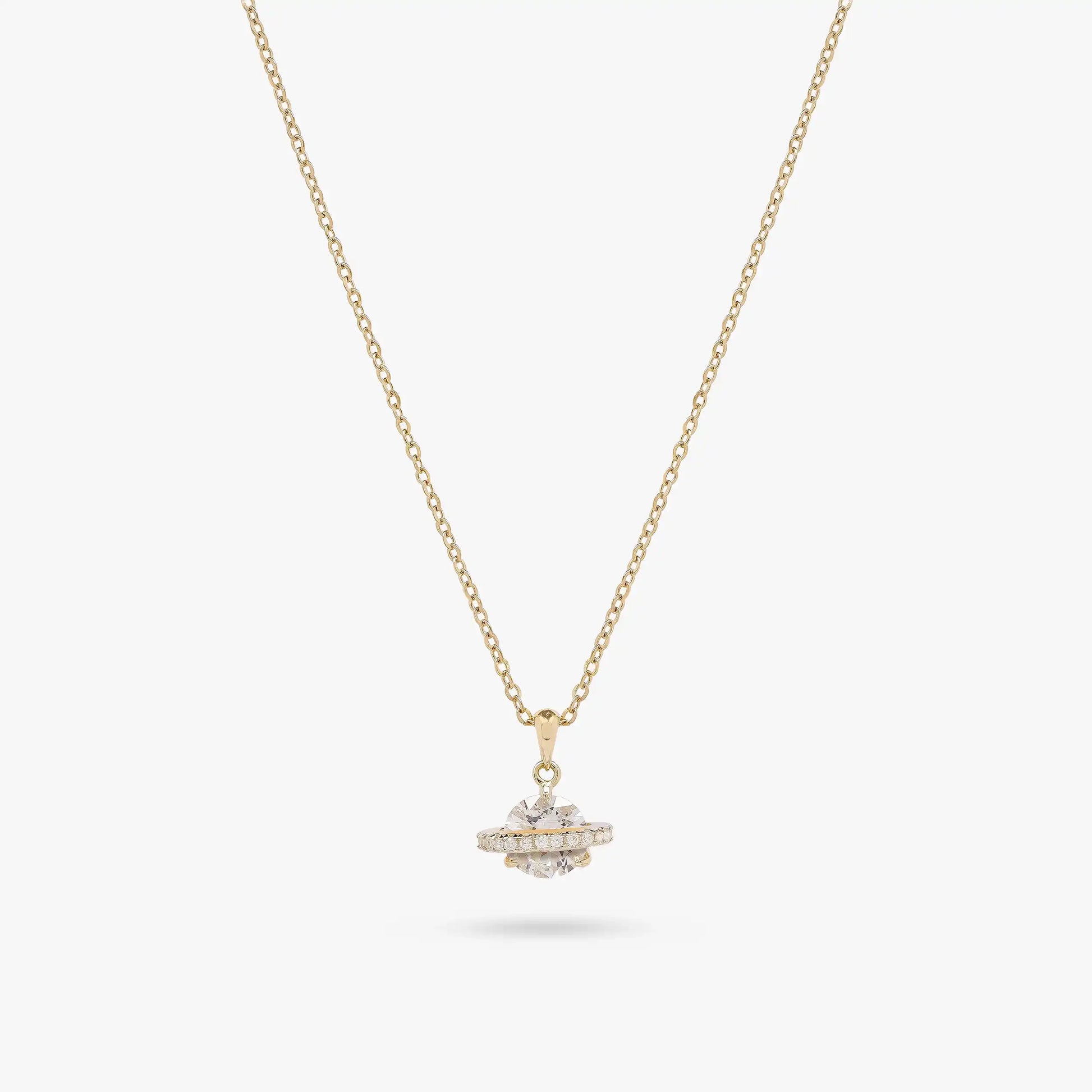 The Orbi Necklace captures the beauty of motion and balance — a symbol of grace that revolves around timeless charm. Crafted in real 925 Sterling Silver with a radiant gold finish, it features a central crystal surrounded by a delicate circular band of smaller stones, creating a luxurious, floating illusion.