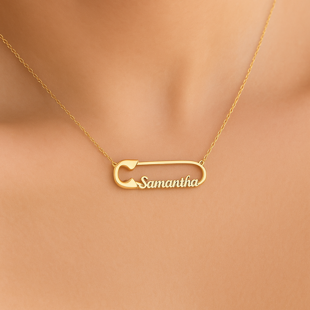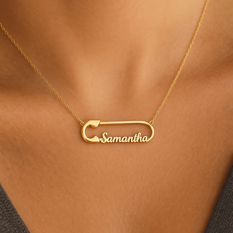 Redefine bold with the Safety Name Necklace, where personal identity meets rebellious style. Featuring a unique safety pin-inspired design fused with your custom name, this necklace blends punk-chic with a deeply personal touch — perfect for trendsetters who own their individuality.